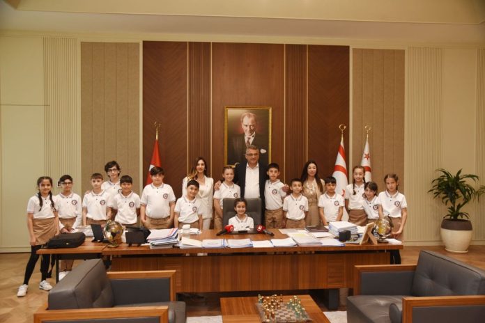 Cumhurbaşkanı Tufan Erhürman, 23 Nisan kutlamaları çerçevesinde Şehit Yalçın İlkokulu öğrencilerini kabul etti. Kabulde Okul Müdürü Gönül Özal ve öğretmen Ayşe Yücel de hazır bulundu.