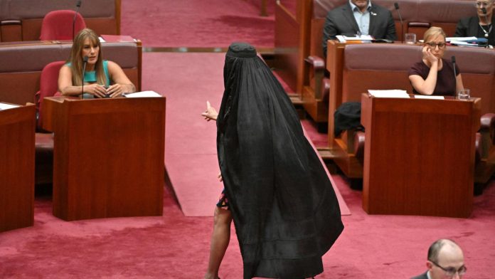 Senatör Hanson, dün, Avustralya’da burka ve yüzün tamamını kapatan kıyafetlerin yasaklanması için yasa tasarısı sunma izni verilmemesinin ardından “tepki göstermek amacıyla” burka giymişti.