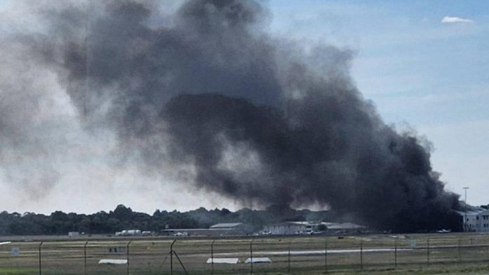 Çarpmanın etkisiyle hangarda büyük bir yangın başlarken, bölgeden yoğun siyah dumanlar yükseldiği bildirildi.