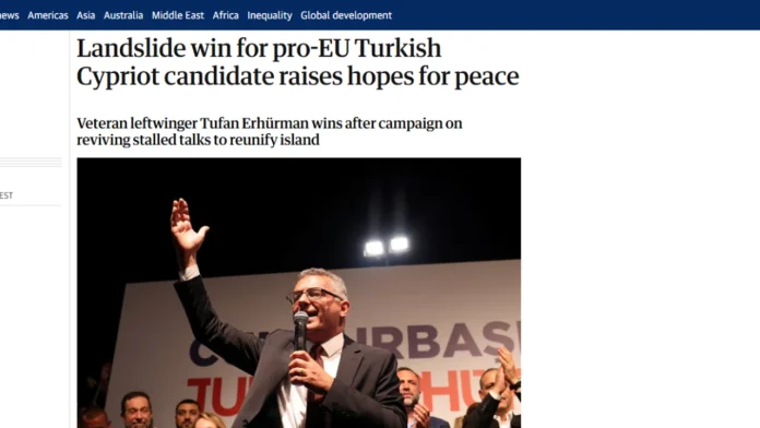 The Guardian, sonucu “AB yanlısı Kıbrıslı Türk adayın ezici zaferi barış umutlarını artırdı” şeklinde nitelendirdi.