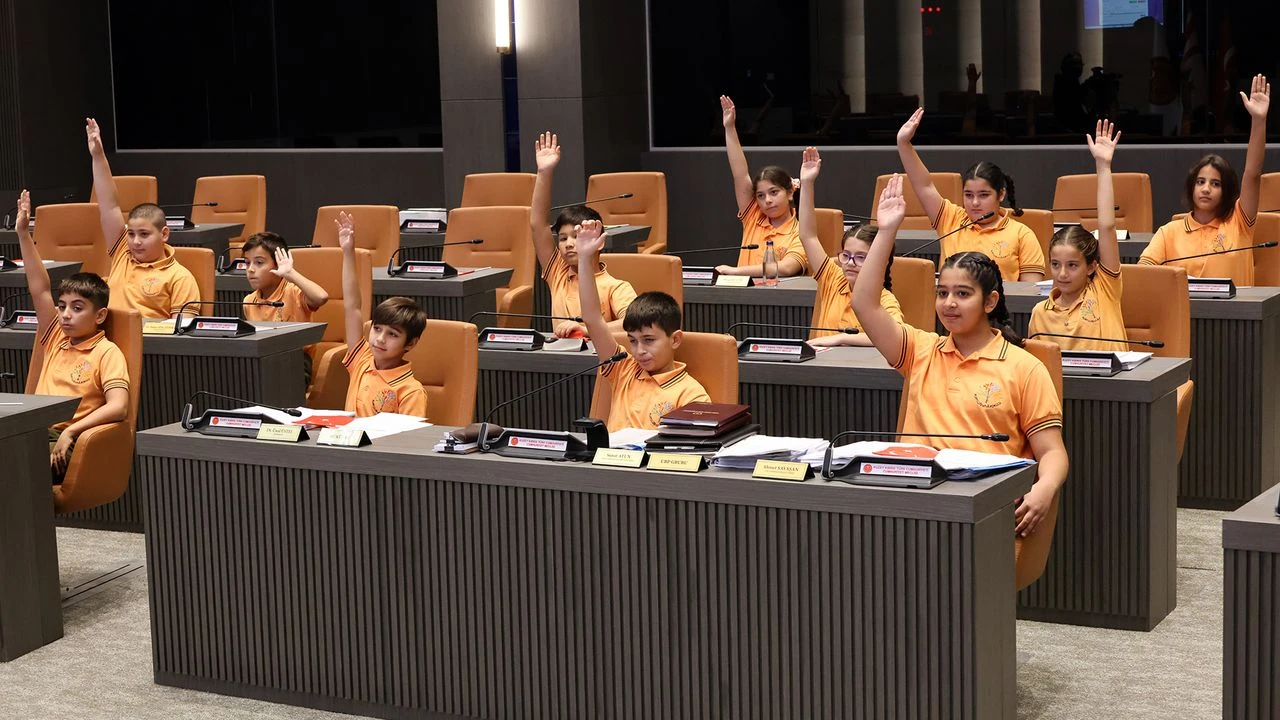 Öğrenciler, Genel Kurul’da yaptıkları konuşmalarda, çocuk haklarına dikkat çekti; taleplerini Meclis Başkanı Ziya Öztürkler’e iletti.