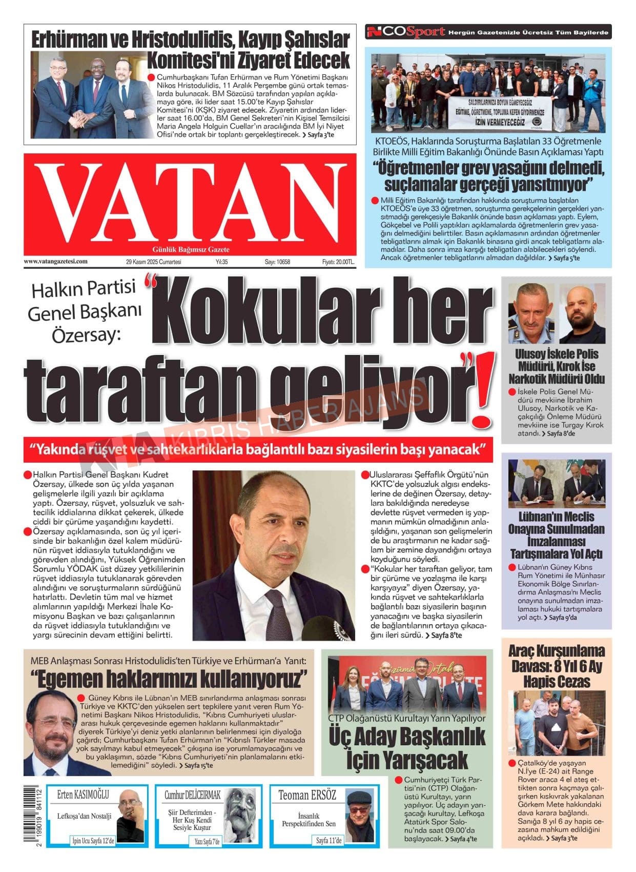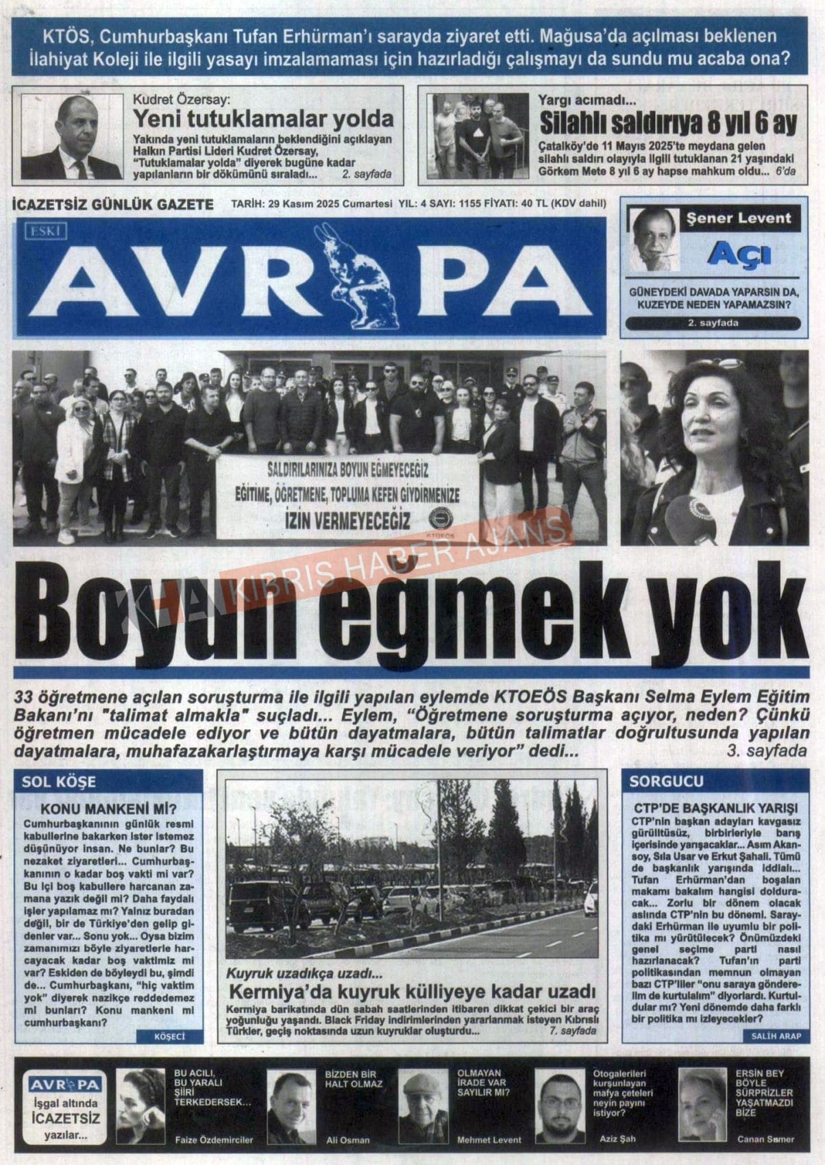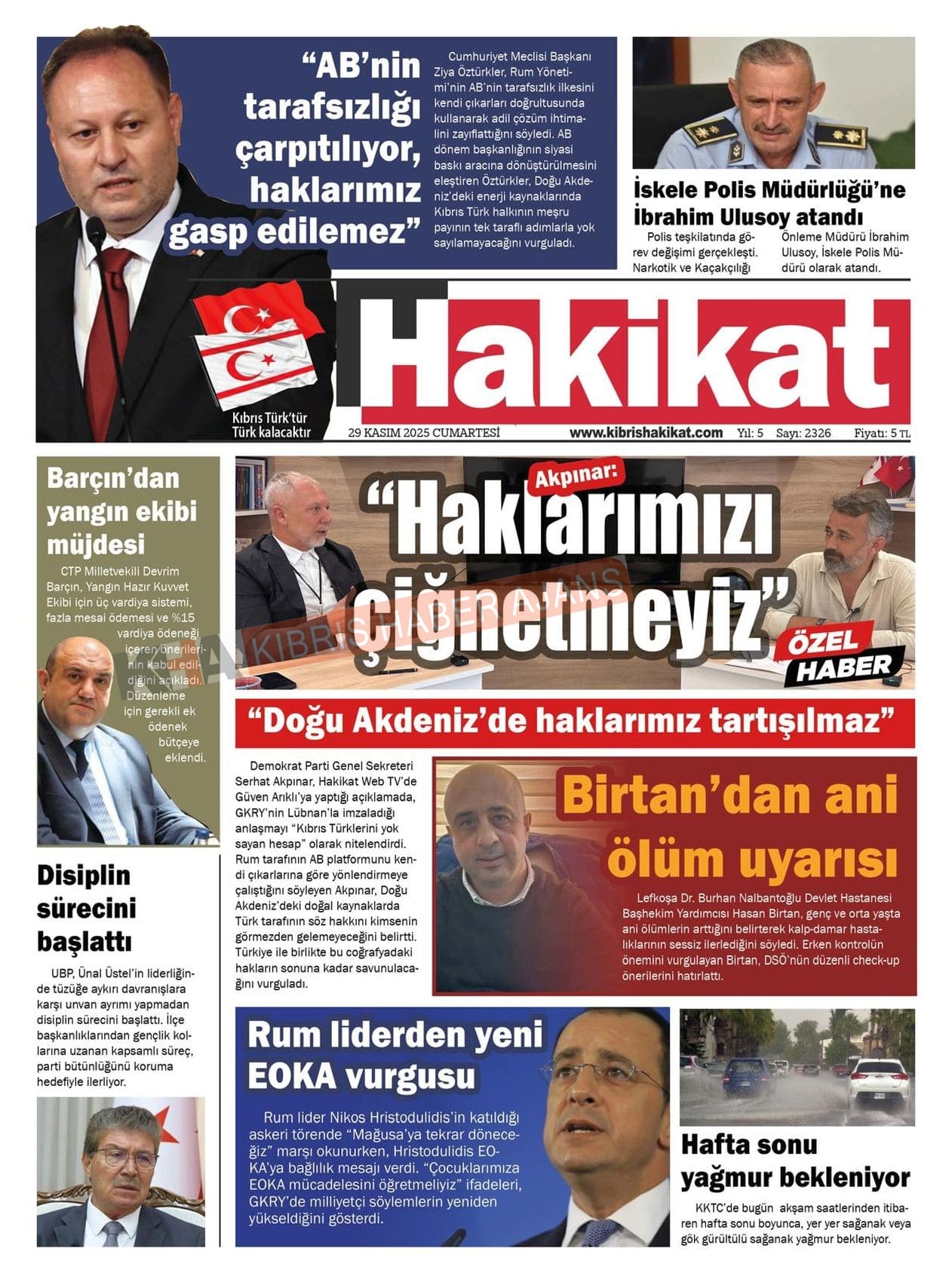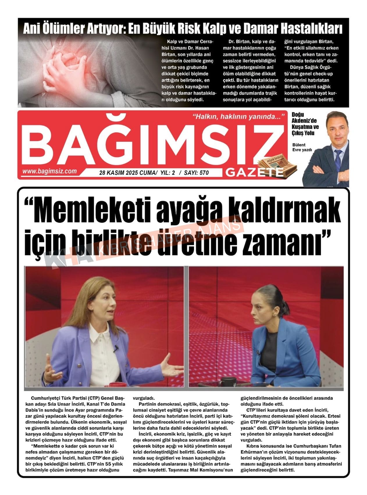 Sitede yayınlanan gazetelerdeki içeriklerden gazete sahipleri sorumludur. Yayınlanan gazeteler ve içeriklerinden Kıbrıs Haber Ajans ve Ajans Cyprus sorumlu tutulamaz.