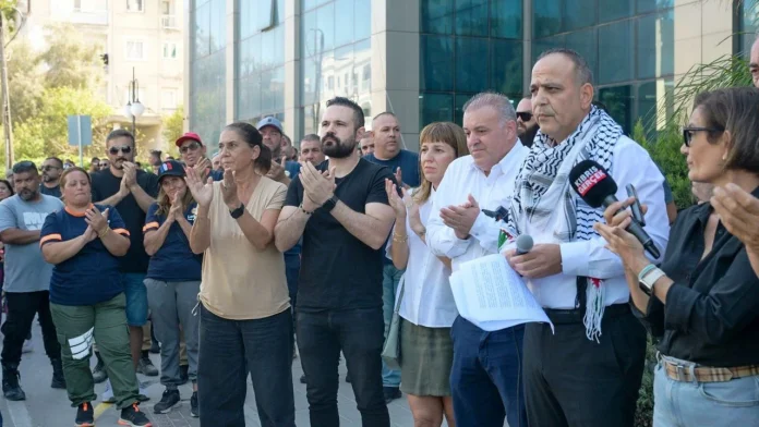 Filistin halkıyla dayanışmanın sembolü olarak belediye binasına Filistin bayrağı da asılırken, Başkan Harmancı boynuna Filistin bayrağı renklerini taşıyan puşi taktı.