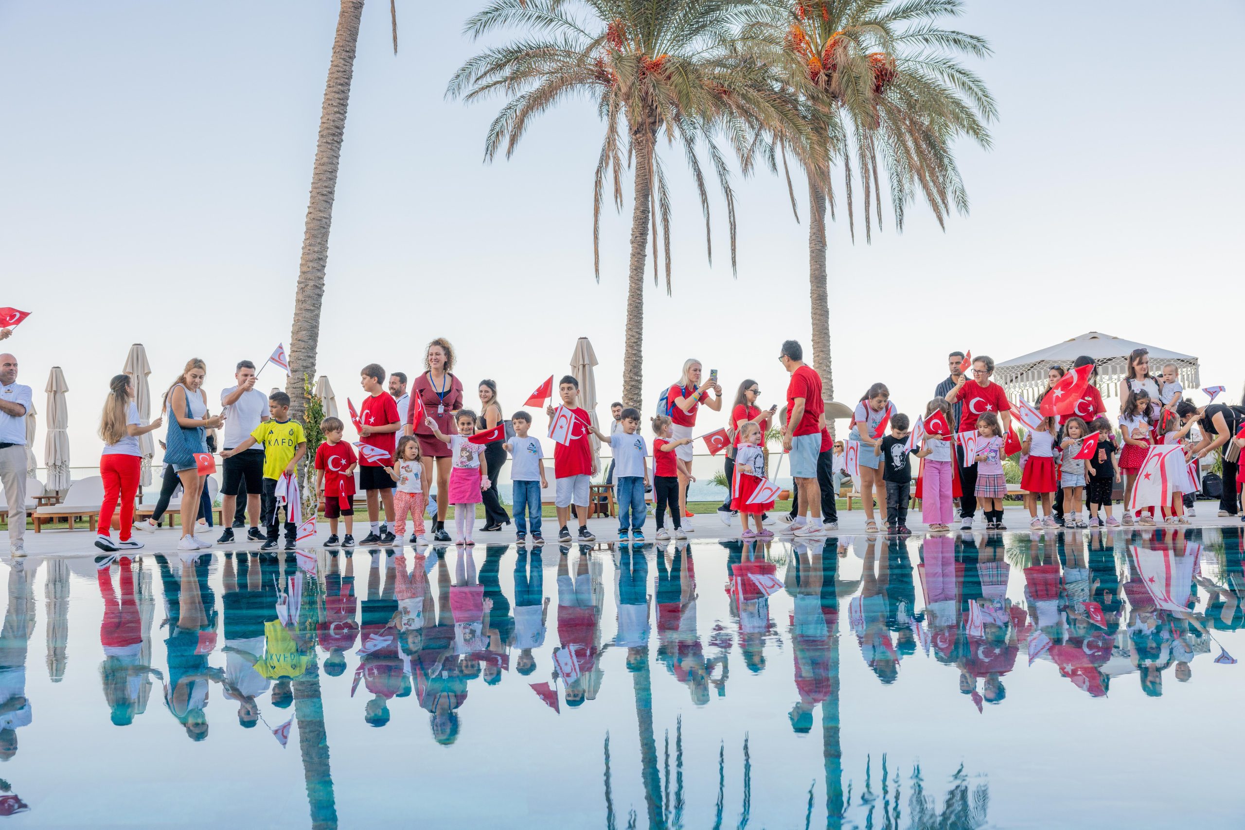 Havuz başı kortej yürüyüşü ile başlayan kutlamalar, kırmızı-beyaz renklerle donatılan alanda vals ve zeybek gösterileriyle devam etti. Görsel şölen sunan bu özel performanslar, günün en dikkat çeken anları arasında yer aldı.