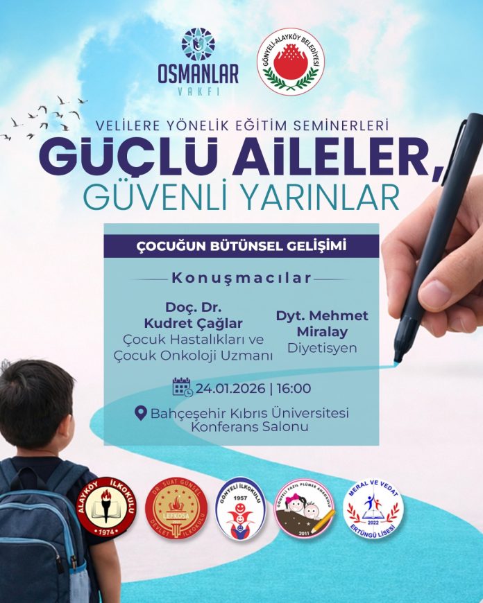 Gönyeli–Alayköy Belediyesi ile Osmanlar Vakfı iş birliğinde hayata geçirilen “Güçlü Aileler, Güvenli Yarınlar” başlıklı velilere yönelik eğitim seminerleri serisi devam ediyor. Program kapsamında düzenlenecek ikinci seminer, “Çocuğun Bütünsel Gelişimi” temasıyla gerçekleştirilecek.